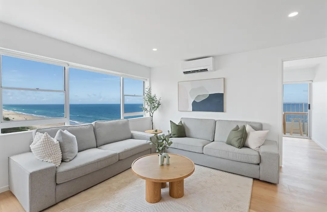 寝室2室のThe Coastal - Fully Renovated Beachfront 3 Bedroom Unit With Parking & Pool ゴールドコーストアパートは、Coomera鉄道駅から25キロメートルで、キング タッツ パット パットから歩いてたった6分の場所にあります。 サンデッキ付きのこの135m²のアパートはアドレナリン パーク少し離れたに位置しています。
